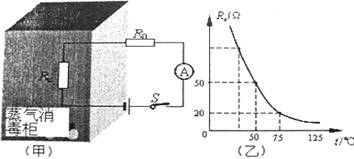 21、学校食堂内普遍使用高温高压蒸气消毒柜对餐具进行消毒,图(甲)为自动测定消毒柜内温度的电路原理图,其中R0为定值电阻,A为温度指示计(其实质是一只量程为0.6A的电流表),RX为热敏电阻,其阻值与温度的关系如图(乙)所示。