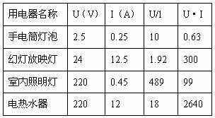 15.右表给出的是某同学查找到的一些常见的用电器的电压、电流及一些计算的结果,从表中数据可以看出:电阻最大的用电器是 ,电功率最大的用电器是 。
