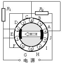 22.如图是一个电热器的工作原理图,电热器内有两个阻值分别为R1和R2的电热丝,R2=2R1。旋转开关内有一块绝缘圆盘,在圆盘的边缘依次有0,1,2,- 9共10个金属触点。可以绕中心轴转动的开关旋钮两端各有一个金属滑片,转动开关旋钮可以将相邻的触点连接。如旋钮上的箭头指向图中位置E时,金属滑片将1、2触点接通,同时另一端将6、7触点接通。用这个旋转开关可以实现电热器多挡位工作的要求。将此电热器接入家庭电路中,向右转动开关旋钮使金属滑片从如图的E位置转到C位置时,电热器消耗的功率为PC;转到A位置时,电热器消耗的功率为PA。则PC :PA是 。