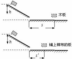 27.某兴趣小组用以下实验装置“探究从斜面上下滑的物块,在水平面上滑行的距离与哪些因素有关”。实验中让木块分别从不同高度由静止开始沿光滑斜面下滑,最终静止在与斜面相接的水平木板或铺上棉布的板上。用刻度尺测量每次开始下滑时的高度h和在水平板面上滑行的距离s,记录如下表: