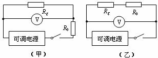 28.现有一个可以显示通过自身电流的电阻器Rg,其允许通过的最大电流为1mA,阻值约为几百欧。另外还提供以下器材:量程为0-10V的电压表、阻值为7500Ω的定值电阻R0、电压可调的电源、开关各一只,导线若干。为了测出这一电阻器Rg的阻值,甲、乙两同学分别设计了如下两个电路: