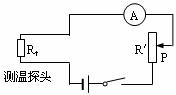 (2)保持(1)中滑动变阻器R′接入电路的阻值不变,当把测温探头Rt放到某待测温度处,电流表的示数恰为10mA,则此时Rt的阻值为多大?对应的温度为多高?