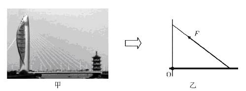 17.芜湖临江桥是安徽首座独塔单索面斜拉桥(如图甲所示)。将大桥的结构简化,可抽象成图6乙所示的杠杆模型,若将其中O点视为支点,请在图乙中作出拉索对桥面拉力F的力臂T.(保留作图痕迹)。