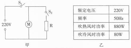 55.(6分)电吹风是现代家庭的常用电器。如图甲所示是电吹风的电路原理图,R是电热丝,M是带动风扇转动的电动机,某电吹风的主要技术参数如图乙所示: