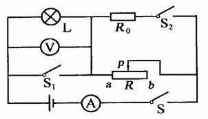 22.图所示电路,电源电压不变,灯泡L标有“6V 3w” 字样。当S闭合,S1、S2断开,滑片P从b端滑到中点时,电流表的示数变化了0.1A,此时电压表的示数为6V;保持滑片P的位置不变,闭合S1、S2,电流表的示数又变化了2A。则电源电压和定值电阻R0的阻值分别为