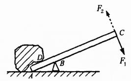 32.图是人们用木棒撬石块的示意图。撬石块有两种方法:第一种是以B点为支点,在C点用与棒垂直的力F1向下撬;第二种是以A点为支点,在C点用与棒垂直的力F2向上撬。(木棒自重不计)