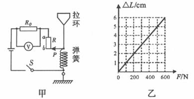 27.(8分)为锻炼身体,小刚利用所学物理知识设计了一个电子拉力计,如图甲是其原理图。硬质弹簧上端和金属滑片P固定在一起(弹簧的电阻不计,P与R接触良好且摩擦不计)。定值电阻R0=5Ώ,R是一根长为5㎝的均匀电阻线(阻值跟长度成正比),其最大阻值为25Ώ,电源电压为3V,电压表的量程为0-3V,当不拉拉环时,金属滑片P刚好处于b端。已知该弹簧伸长的长度ΔL与所受拉力F问的关系如图乙所示。求: