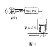 7、如图4所示是磁带录音机录音原理的示意图。录音时,动圈话筒将声信号转换为电信号送到录音磁头;录音磁头是一个蹄形电磁铁,它的磁性强弱随电信号变化,将电信号转换为磁信号:录音磁带贴着录音磁头移动,上面的磁粉被磁化,声音信号被记录在磁带上。关于磁