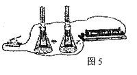 8、小明同学利用如图5所示的装置探究“电流产生的热量与哪些因素有关”。在两个相同的烧瓶中装满煤油,瓶中各放置一段电阻丝,且