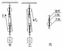 13.在图中,甲、乙两个滑轮组都是由相同的滑轮组合而成。如图丙:大轮重10N,小轮重5N,连杆重1N。先后用甲、乙两种方式提起同样重的物体(G=500N ),如果忽略摩擦力和绳的重力,则下列说法正确的是
