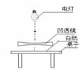 18.如图,夜晚,把桌子放在电灯下面,在桌面放一张白纸,然后再把凹透镜放在白纸上。当逐渐向上移动凹透镜时,可以观察到:通过凹透镜的光束在白纸上所形成的光斑的面积会随着凹透镜移动而逐渐变 ,光斑的亮度则逐渐变 (全部选填“大”、“小”)。