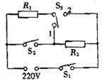 23、(6分)冬天,李霞同学使用电热毯时,发现电热毯有高温档和低温档,她找来说明书,发现电热毯的电路图如下图所示,电热毯工作时电路要么处于A状态:S1闭合,S2断开,S3接1;要么处于B状态:S1闭合,S2闭合,S3接2。