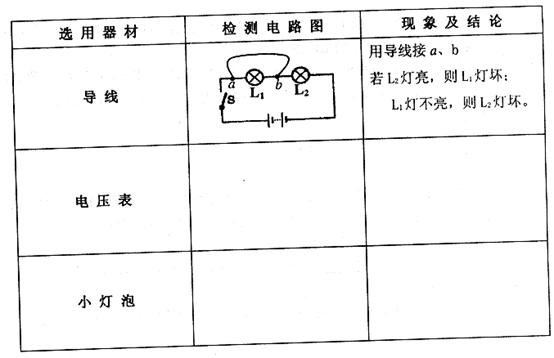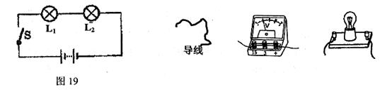 21.(8分)小明在做“组成串联电路”的实验时,电路连好后(如图19所示),闭合开关,两灯均不亮。经检查,电路连接无误,老师告诉他是一个小灯泡坏了。请你帮助小明,在下图所示的实验器材中依次选一种,连入电路,检测出哪只灯泡坏了。请按下面表格的要求填入用电压表与小灯泡的检测实验的内容。