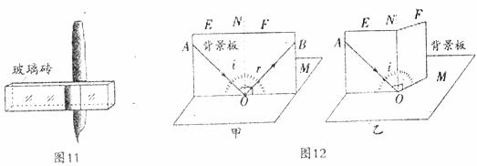 26.在探究“光的反射的实验”中,进行如下操作:把一个平面镜放在水平桌面上,再把一张纸板ENF竖直地立在平面镜上,纸板上的直线ON垂直于镜面。一束光贴着纸板沿某一个角度射到O点,经平面镜的反射,沿另一个方向射出,如图12甲所示。纸板ENF是用两块纸板连接起来的,把纸板NOF向后折(如图乙).观察分析图12,请你写出两条信息: