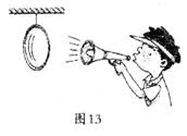 小明想了一会儿,起身找来一个小碟、一段铁丝和一勺洗衣粉。小明将洗衣粉倒入碟子中,加水溶解;然后将铁丝弯成一个带把的铁圈,将铁圈放在水中,使铁圈附上一层薄膜。小明将铁圈放在音响的喇叭前(如图13所示),当喇叭发声时,他发现,薄膜随着声音不断地变化而发生变化。