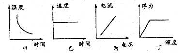 D.丁图表示铁球落入水中,它受到的浮力与水的深度的关系图像