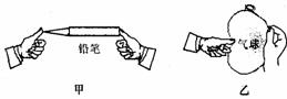 4、在探究“压力作用的效果与哪些因素有关”的活动中,小苏同学按图甲所示进行操作,他觉得左拇指受压的感觉比右拇指要强得多;并且越用力,受压感觉越明显。小吴同学的实验如图乙,他观察到与手掌接触部分气球的形变较小,而用手指顶着的那部分气球形变明显;且手指用力越大,形变越明显。