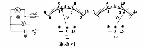 5.在如图甲所示的电路中,已知R=6Ω,开关S闭合时,电压表V和V1的示数如图乙、丙所示,则该电路中的电流为