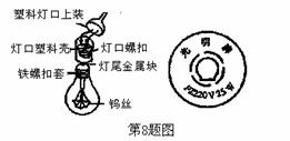 8、白炽灯是日常生活中重要的光源,小明对如图的白炽灯和灯口进行了仔细观察后,明白了许多道理:灯口外壳和灯口上盖都是由塑料或橡胶制成,是由于它们都是 体,这些措施都是为了用电安全;白炽灯的铭牌上,220V表示 ,25W表示 。