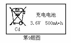 9.如图是某电池外壳上的部分说明,由此说明可知该电池的电压是 V,它充足电后能够储存的电能是 J。电池中含有汞(Hs)、镉(Cd)等多种重金属,电池外壳锈蚀腐烂后会污染环境,危害公众健康,在说明左边的图案中打“×”的普通垃圾箱,它告诉我们 .