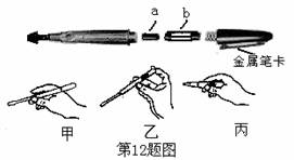 12.如图是测电笔的构造示意图。试说明图中各部分的名称,a: b: ;图中甲、乙、丙三种测电笔的握法中, 种是错误的。