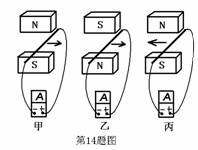 14.如图是探究感应电流方向与哪些因素有关的实验示意图。比较其中的甲、乙两图可以得出感应电流的方向跟 方向有关的结论;比较甲、丙两图可以得出感应电流的方向跟 方向有关的结论.在这个实验中能量的转化过程是机械能转化成 能。