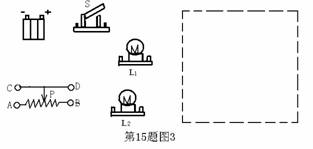 ⑶、用两只灯泡、一个开关(总开关)、-只滑动变阻器、一个电源,设计出满足以下要求的电路:灯L1的亮度不变,灯L2的亮度可调节.请在虚线框内画出电路图并且连接实物图.