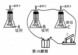 18.与小功率用电器相比,大功率用电器在使用时插头发热比较厉害,而连接的导线不怎么热。这一现象激发小明同学要探究“通电导体产生的热量与什么因素有关”的问题。现有如图所示的器材:装有相等质量煤油的A、B、C三个相同的烧瓶、温度计三支、两根电阻相同的锰铜合金线、一根镍铬合金丝、电源一个、开关一个、导线若干。