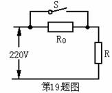 19.如下图所示为电饭锅的电路原理图,当控制开关闭合时电饭锅处于加热煮饭状态,此时功率为1000W,饭熟后,控制开关自动断开,电饭锅处于保温状态,若此时电饭锅的功率为100W,求电热板R和保温器R0的电阻各为多少?(假设电阻值不随温度的变化而变化)