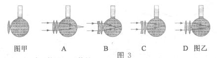 11.在探究近视眼视力矫正问题时,用图3甲的装置模拟眼睛,烧瓶中的有色液体相当于玻璃体,烧瓶左侧紧靠瓶壁的凸透镜相当于晶状体,右侧内壁相当于视网膜,图3乙中的四幅图是一些同学描绘近视眼矫正的方法和光路,其中能达到近视眼矫正目的的是: