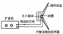 16.作为一种应急措施,有时也可以用扬声器代替话筒。如图所示装置,人对着扬声器的锥形纸盆说话,声音就会使与纸盆相连的线圈在 中振动,从而产生随着声音的变化而变化的电流。这种产生电流的现象在物理学上称为 现象。