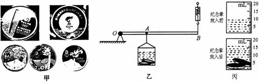 当把两枚相同的纪念章放入量杯中,OB杠杆水平静止时弹簧种读数为0.55N。纪念章放入前、后量杯中的水位如图丙所示。