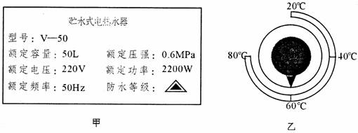 40. (6分)小明家新购置了一台电热水器,电热水器的铭牌如图甲所示。若自来水的温度是20℃,加满水后,小明将温控开关调到如图乙所示的位置。接通电源,加热指示灯亮;达到设定温度时,加热指示灯熄灭。请你帮助小明解答下列问题: