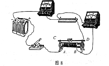(1)在“研究电流跟电压的关系”时,他连接的电路如图8所示。但电路中有一根导线接错了,请你用笔在图中将接错的导线打上“×”,并画出正确的接线。