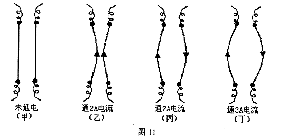 17.学习了电流的磁场和磁场对电流有力的作用之后,某学校兴趣小组的同学猜想:“既然电流周围存在着磁场,那么两根互相靠近的通电导体之间将会发生相互作用”。他们将两根导线(可伸长)平衡放置后固定(如图11甲所示),然后通上如图11(乙、丙、丁)所示的电流,通过反复实验证明了他们的猜想。