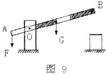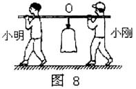 7.小明和小刚用一根均匀的木棒抬着一袋重400N的小麦,如图8所示,小明为了减轻小刚的负担,他应__________ (选填“增大”、“减小”)悬挂点O与他的肩头之间的距离,若只让小刚承担150N的力(不考虑木棒的重力),那么小明、小刚两同学的肩头到O点的距离L甲和L乙之比应为__________。
