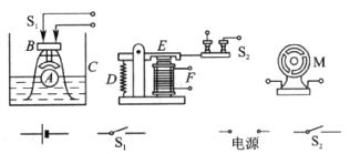 18.我市一所农村初级中学,常常因为不能及时给水塔注水而停水.小明知道后,想利用如图所示的器材设计一个自动注水装置:A是浮子(重约5 N),B是金属触头(重约10N),C为水塔上的柱形蓄水池,M是带水泵的电动机,D是弹簧,E是衔铁,F是电磁铁,S1、S2分别为触头开关.