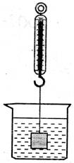 21、一正方体实心铁块的密度为7.8×103kg/m3,体积为8×10-6m3。如下图所示,现在用一弹簧测力计吊着该铁块放入盛水的容器中,铁块全部浸没在水中。求: