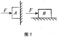 15.如图7所示,物体A重30N,用F等于50N的力垂直压在墙上静止不动,则物体A所受的摩擦力是___________N;物体B重30N,受到F等于20N的水平推力静止不动,则物体B所受的摩擦力是___________N.