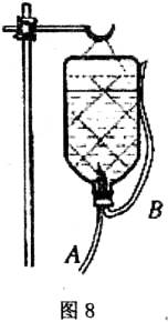 16.如图8所示的是医院为病人输液时用的吊瓶,瓶中插入两条管子,A管是输液管、B管是空气管。在输液过程中,如果发现病人的血液沿输液管回流,可将吊瓶适当地升高,血液就会随着药液重新流入患者的血管不再回流。这是因为当吊瓶升高后,增大了流入患者血管约液的___________,阻止了血液的流出。B管的作用是______________________.
