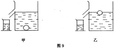 17.如图9所示,把一个小球分别放入盛满不同液体的甲、乙两个溢水杯中,甲杯中溢出的液体质越是40g,乙杯中溢出的液体质量是50g,则小球的质量是__________g,甲、乙两杯中液体的密度之比ρ甲:ρ乙__________4:5.(填“大于”、“等于”或“小于”)