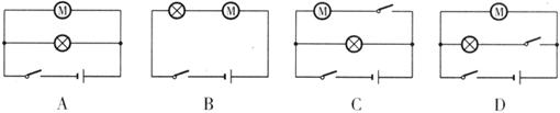 10.教室里投影仪的光源是强光灯泡,发光时必须用风扇给予降温,为了保证灯泡不被烧坏,要求:带动风扇的电动机启动后,灯泡才能发光;风扇不转,灯泡不能发光,则在如图所示的四个电路图中符合要求的是( )。