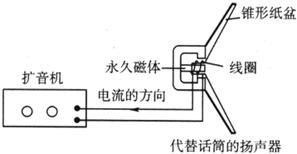 16.作为一种应急措施,有时也可以用扬声器代替话筒.如图所示装置,人对着扬声器的锥形纸盆说话,声音就会使与纸盆相连的线圈在___________中振动,从而产生随着声音的变化而变化的电流.这种产牛电流的现象在物理学上称为___________现象。