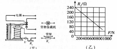 21.小明设计了一种“自动限重器”,如下图(甲)所示。该装置由控制电路和工作电路组成,其主要元件有电磁继电器、货物装载机(实质是电动机)、压敏电阻R1和滑动变阻器R2等。压敏电阻R1的阻值随压力F变化的关系如图(乙)所示。当货架承受的压力达到限定值,电磁继电器会自动控制货物装载机停止向货架上摆放物品,已知控制电路的电源电压U=6V,电磁继电器线圈的阻值忽略不计,请你解答下列问题: