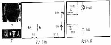 (2)火车的车厢后面有两间厕所,只有当两间厕所的门都关上时(每扇门的插销相当于一个开关),车厢中的指示牌内的指示灯才会发光,指示牌就会显示“厕所有人”字样,如图乙所示,提醒旅客两间厕所内都有人。这里面的电路是怎样设计的?请你帮小科把答题卷图中的各元件符号连接成符合要求的电路图。