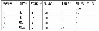 1.为了探究液体温度升高时吸收的热量与哪些因素有关,某同学做如下实验:在四个相同的烧杯中分别盛有水和煤油,用同样的加热器加热,数据如下表: