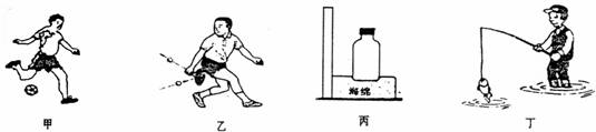 D.丁图是鱼线的拉力使钓鱼杆发生形变