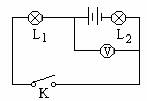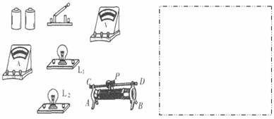 7、下图中,要求:变阻器只能调节L1亮度,但不能调节L2亮度,开关控制整个电路,用电流表测量灯泡L2中的电流(0.3 A),电压表测量灯泡L2电压,将符合要求的电路图画在虚线框内,并将实物连接起来。