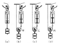 10.某小组同学研究动滑轮的使用特点,他们先用弹簧测力计缓慢提起钩码,如图(a)所示,再分别用重力不同的动滑轮甲、乙、丙(G甲>G乙>G丙)缓慢提起相同钩码,如图(b)、(c)、(d)所示.请仔细观察图中的操作和弹簧测力计的示数,然后归纳得出结论.