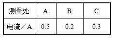 2.小丽同学进行探究实验的电路如下图所示,她用电流表分别在A、B、C三处测得电流如下表。请帮她完成如下几项工作: